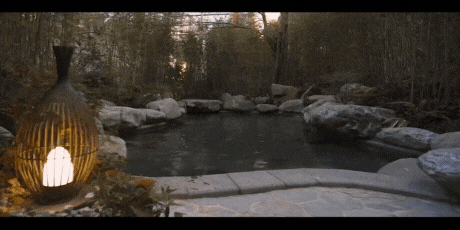 白天,阳光在树叶的缝隙里,闪烁着细细碎碎的光,泡池都被树木、翠竹、篱笆等包围,仿佛置身于日式京都小庭院。